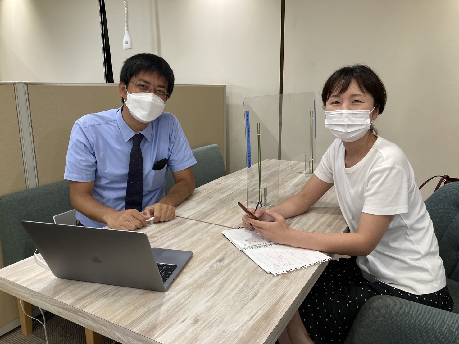 当初何から始めたら…とお悩みだった奥村さん。小杉センター長に創業への手順相談から始まり
